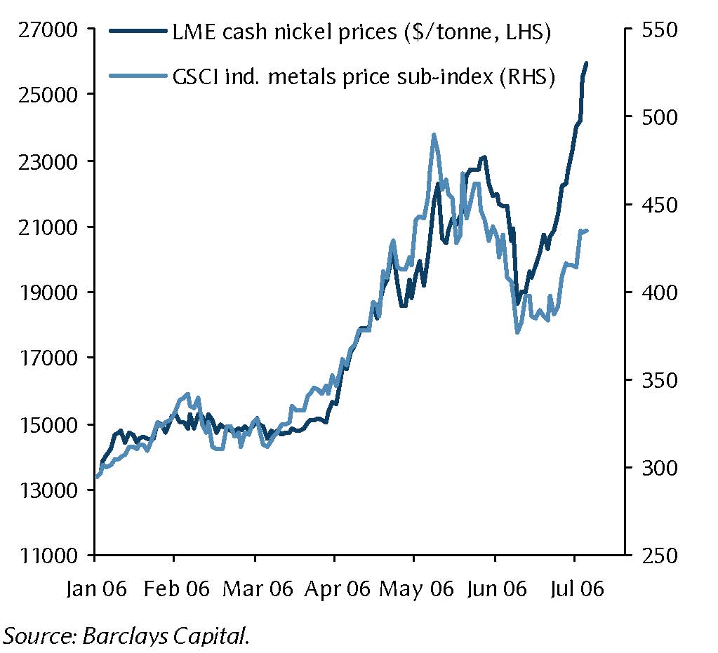 Barclays Capital points out that the nickel price is clearly a reflection of ever-tightening fundamentals. LME stocks have diminished rapidly in 2006 and currently represent only about three days forward cover. There is real concern from producers that they simply won’t get the nickel they need.
