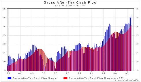 To support their case, GaveKal has produced a chart representing the gross after tax cash flow margins of the total US corporate sector. No need to argue there’s no mean reverting trend apparent.