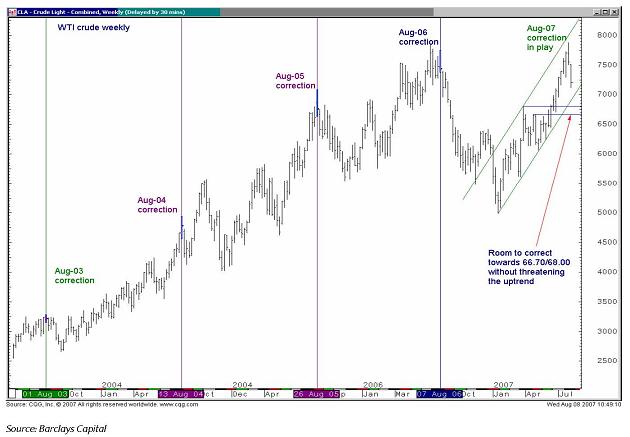 Additionally, technical chartists at Barclays Capital note the last few years have shown a trend for the oil price to fall through August, so in this respect the price action in the first part of the month suggests this year will be no different.