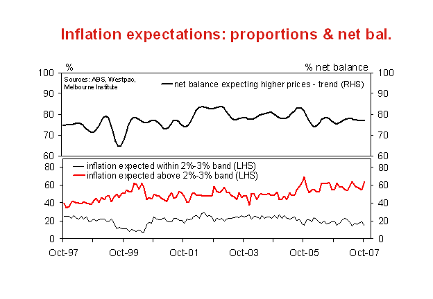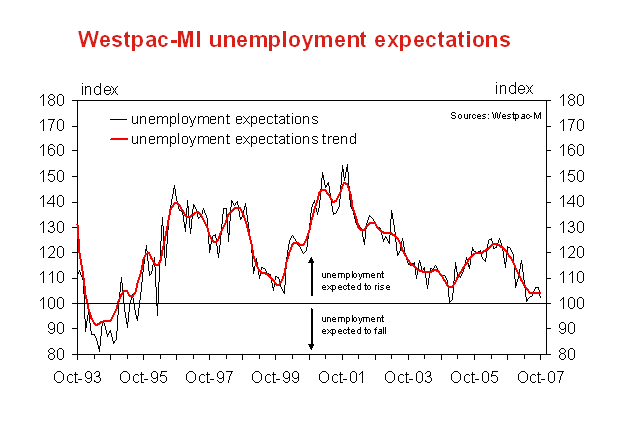 Consumer unemployment expectations fell 4.1% in October, their first fall since May. Their trend has been essentially flat since June, but their deviation from long run levels remains highly negative, and therefore consistent with strong labour market opinions, and continues to point to a strong outlook for full-time jobs growth into 2008.