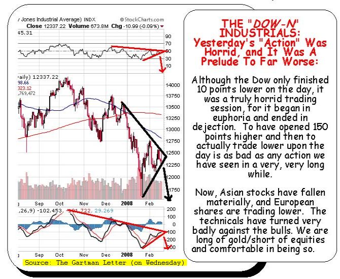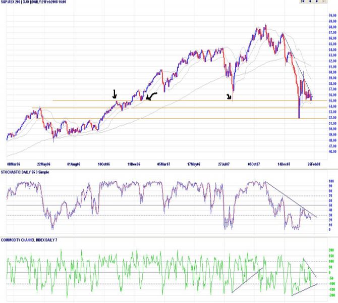 I only had to look at my pc screen to know our voice on the phone was referring to a story we published the day before, after the close of the market on Wednesday (see “Aussie Market To Breach Technical Support On Thursday?”, February 20, 2008). What previously appeared like a market that was going to comfortably book a gain of 80 or even 90 points for the day was gradually giving up all those gains.
