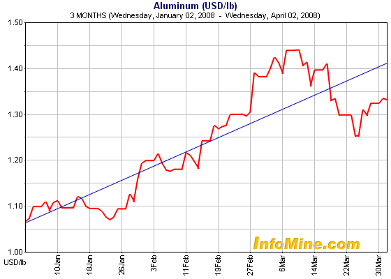 The aluminium price rose to US$1.44/lb in early March, before the general commodity price bubble began to leak. This coincided with the melting of heavy snow in China which had crippled production, but by March 14 the rescue of Bear Stearns and subsequent fear saw a swift deleveraging of overbought commodity fund positions. Aluminium fell back to US$1.25/lb. It closed last night at US$1.31/lb, currently wrestling with volatility in the US dollar.