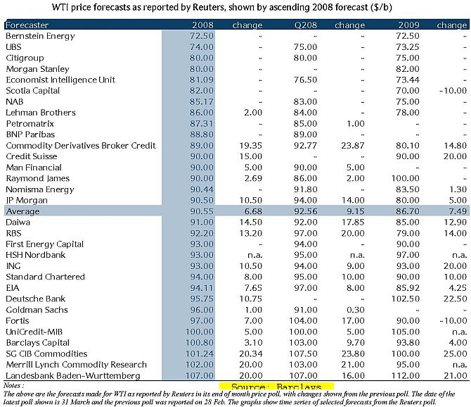 The Reuters price poll of oil analysts is conducted every month, and what is most striking is firstly the US$72.50-107.00 range of 2008 averages which gives a mean of US$89.30 – 24% below last night’s close of US$117.48. What is equally striking is the accompanying list of revisions to even get to that mean. Some are quite material.