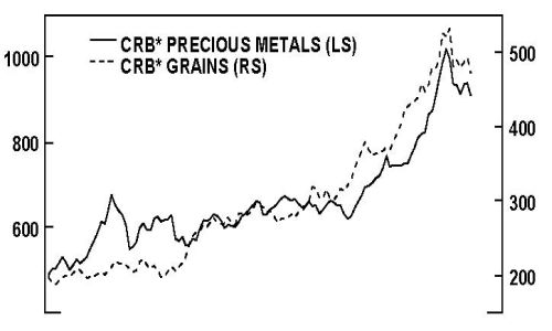 Put all traded grains together in an index and compare them to gold from the beginning of 2006, and it looks like this: