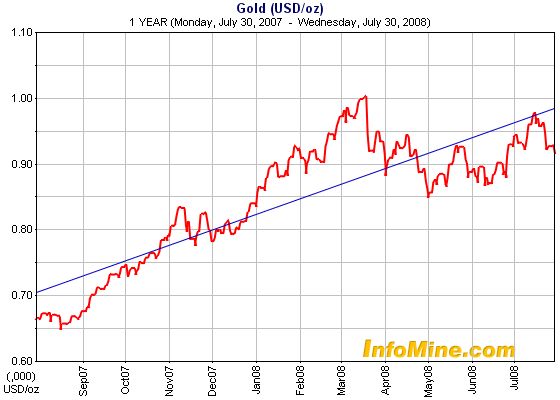 The most recent attempt saw the gold price bang up against the trendline on July 15 – the day the US government announced it would save Fannie & Freddie. But on the announcement of the rescue package, it was game over once more. The US$1000 peak was hit in March, when Bear Stearns went down. Bear Stearns was a mere insect compared to Fannie & Freddie, yet gold has not pushed above this peak again. In the one-year history of the credit crunch, has anything been as perilous as Fannie & Freddie day?