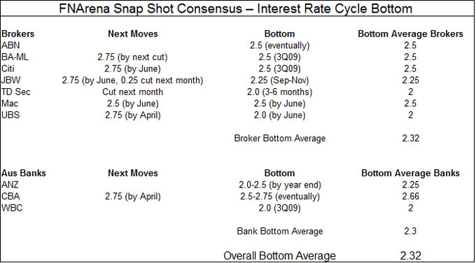 The only significant differences in opinion within the Australian broking and banking communities are: When will the next cuts take place? What will the ultimate bottom be? And when will we hit that bottom? And even these assessments are fairly consistent across the banks and brokers tracked by FNArena.