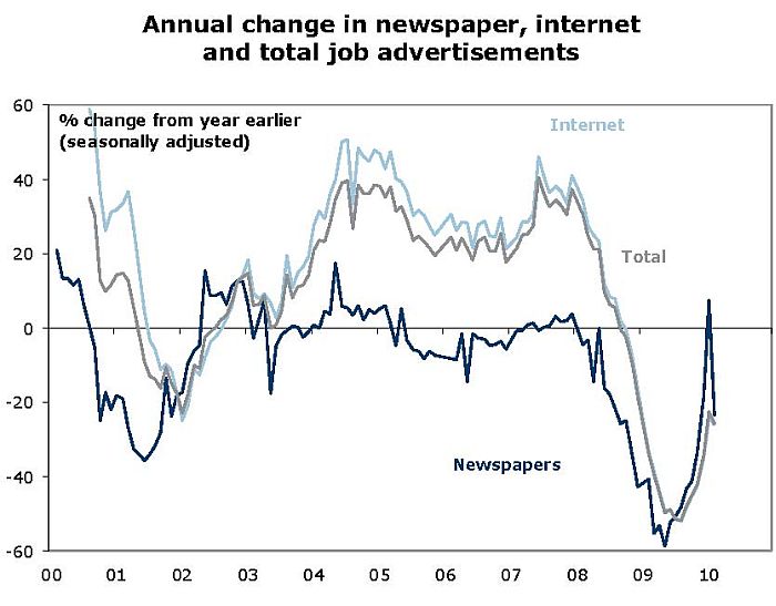 ANZ reports the number of job advertisements in major metropolitan newspapers fell by 16.6% in January after growing by 11.6% in December, to a seasonally adjusted average of 8,796 per week. Newspaper job advertisements were 23.5% lower than in January 2009.
