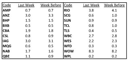 To that end, a new table appears below noting short positions current on the S&P/ASX20 stocks, and week on week changes.
