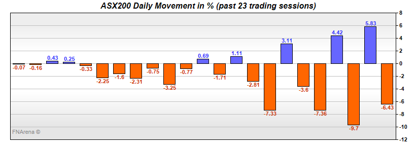 The bad news is the ASX200 fell -9.7% yesterday and the futures are down another -4.1% this morning. The good news is the ASX200 yesterday fell to the magic number of 5000, still 121 points above Friday’s low. If the futures are accurate (-201) we’ll hit a new low today. Whether that will be an intraday low or closing low remains to be seen, and could prove critical.