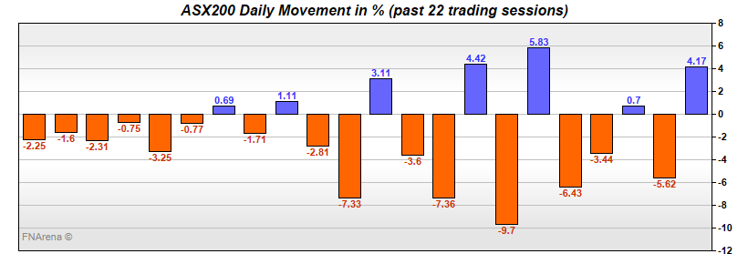 But it was that rescue package that later had sentiment fading, as a grave Scott Morrison pre-empted the government’s next, and comparatively massive, fiscal stimulus tranche, at the same time postponing the federal budget to October. Some of the intraday moves in share prices did look overly wild, thanks to computers, so some sanity crept in in the afternoon. The big moves in sectors in both directions netted out.