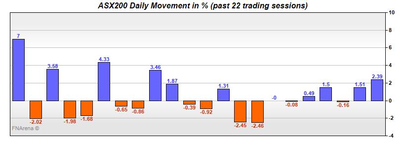 The ASX200 gave away a 50 point first hour gain to be down -50 with an hour to go, before recovering to the close. A wild day at any other time.