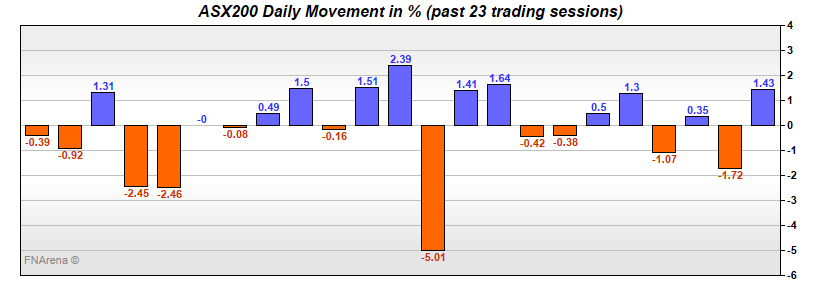 The ASX200 opened lower yesterday, in line with a weak session on Wall Street and a -58 point prediction from the futures. It bottomed at down -79 points fifteen minutes in, when once more the cavalry arrived.