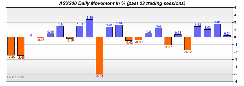 A 1% gain for the ASX200 is a good day in anyone’s books but realistically the index opened up around 70 points yesterday and basically stayed there all day, until slipping a bit at the death. It was a lacklustre session featuring tepid volume.