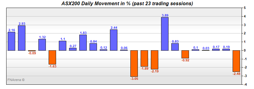 From last Tuesday’s close to yesterday’s close, the ASX200 fell -29 points. Pretty dull old market. Unless you happened to be paying attention during the day. Yesterday’s close of up 9 points represented the third single-digit move in a row, but yesterday’s trading was the most volatile of three very volatile sessions.