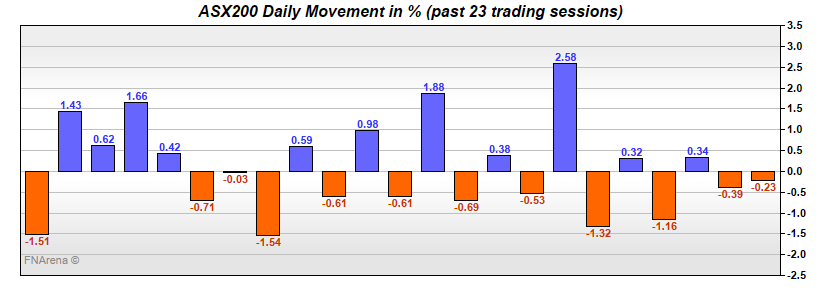 The possibility of the ASX200 marking two consecutive sessions in one direction yesterday was thwarted by the US dollar gold price. The futures suggested down -27 points before the open, but -11 was the best the index could do before rallying to up 20 by the close.