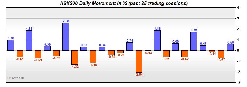 The ASX200 opened slightly higher yesterday but after fifteen minutes fell -50 points, more in line with Wall Street overnight. Maybe one computer confused a plus for a minus. Thereafter the index chopped its way back to a flattish close.