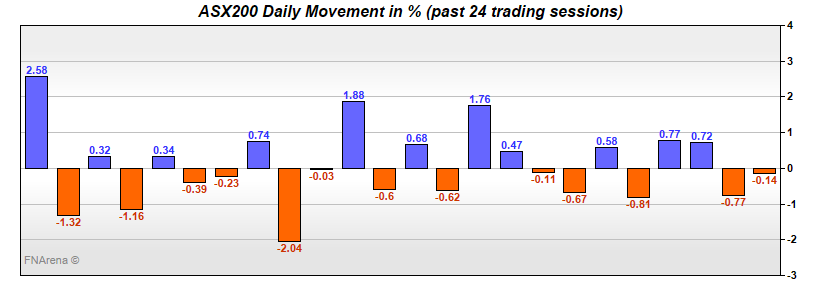 Wednesday’s 40-plus point rally for the ASX200 was all about big winners and big losers among reporting companies, with the winners outpacing the losers. Yesterday’s -40 point-plus fall for the ASX200 was all about big winners and big losers among reporting companies, with the losers outpacing the winners.