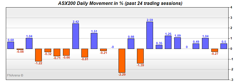 These were two of the highlights of a session that began positively from the open yesterday on Wall Street strength. The ASX200 put on the bulk of gains in the first fifteen minutes, before wobbling its way to a slightly higher close.