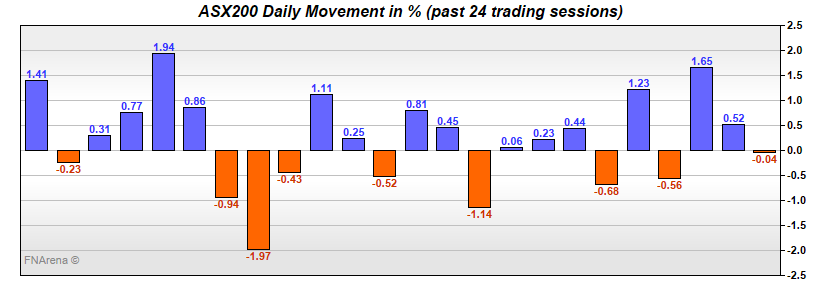 Following the big rally yesterday, the SPI Overnight closed down -33 points or -0.5%.