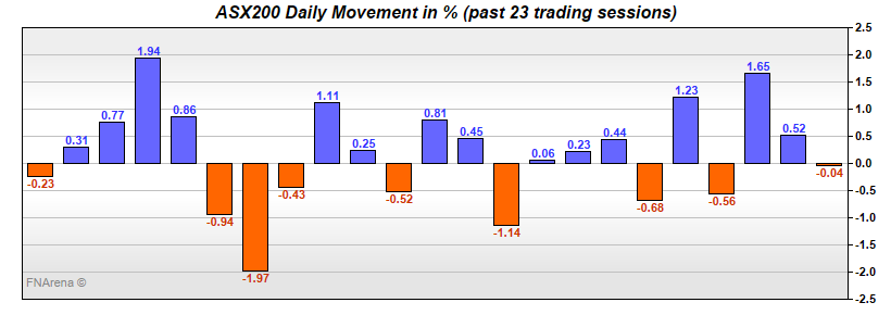 It looked like the ASX200 was going to yawn its way to a flat close yesterday right up until the last hour, when it suddenly took off and closed up 35 points. The futures had suggested down -33.