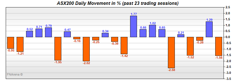 Funny old market yesterday. The ASX200 chopped around doing not much from the open to be up 10 points and then suddenly at 12pm it fell to be down -25. At 12.30pm it bounced and returned to the flatline. With ten minutes to go it was up 10, and then closed down -19.