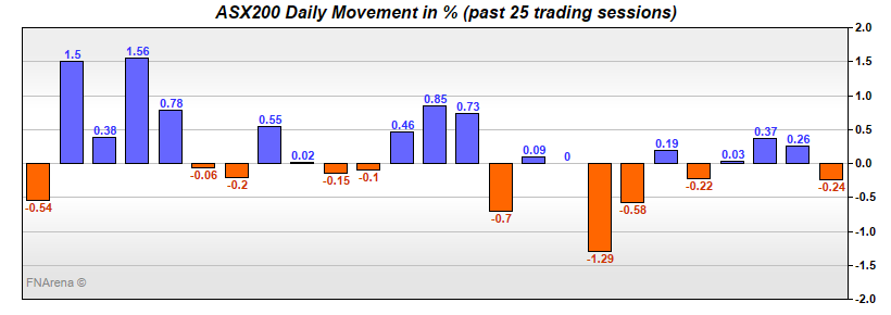 Healthcare provided the biggest counter to the banks (-0.9%), with selling in ResMed ((RMD)) firing up again (-4.6%). Real estate lost -0.7%, with bond yields little moved.