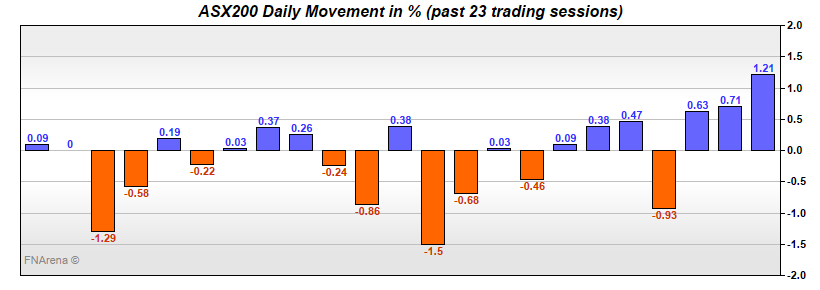 The ASX200 opened up 39 points in the first twenty minutes yesterday, doubling the futures’ expectation, and closed up 44. There was a bit of chop in between but largely it was a one step-up session, despite positive macro newsflow through the day.