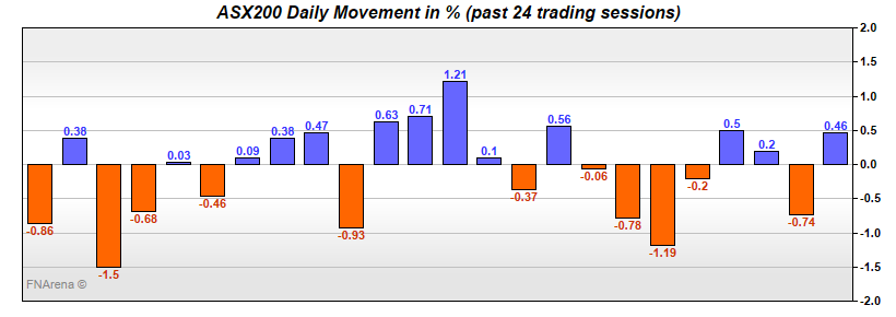 For the third day running, the ASX200 fell in the morning and rallied in the afternoon. Yesterday, the index took a 50 point round trip from the open to the low and back to the close of up 14, regaining the 7200 mark for now.