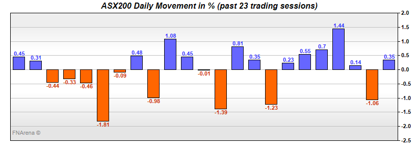 After a week of steady rallying, the ASX200 went almost nowhere yesterday – a slight gain leading the index to scrape above 7800. Five sessions ago we were under 7600, following a rock’n’roll ride that began mid-April when we saw a new high of 7910.
